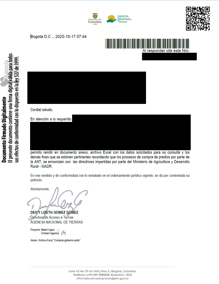 (20) Respuesta ANT sobre los predios comprados en el gobierno de Gustavo Petro: los datos de predios y peticionario se protegen de acuerdo con el principio de circulación restringida establecido en el literal c) del artículo 4 de la ley 1266 de 2008 y la sentencia T-729 del 2002 de la Corte Constitucional, los datos personales no podrán estar accesibles de forma masiva, por internet o cualquier otro medio de comunicación.