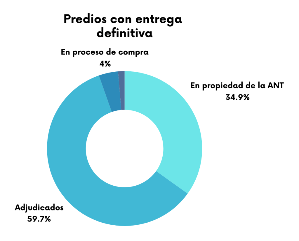 - La ANT reporta 149 predios entregados de forma definitiva a campesinos, los cuales suman 37.488(ha), no obstante, hay 52 predios (10.068 ha) que aún no han sido adjudicados y 6 predios (2.364 ha) que aún están en proceso de compra.