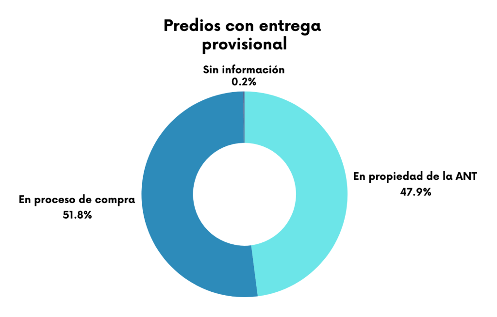 - Como predios entregados de forma provisional a campesinos, se tienen 438 que equivalen 105.555 (ha), de los cuales 210 predios (56.723 ha) son de propiedad de la ANT y 227 predios (48.801 ha) aún están en proceso de compra.