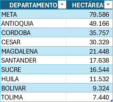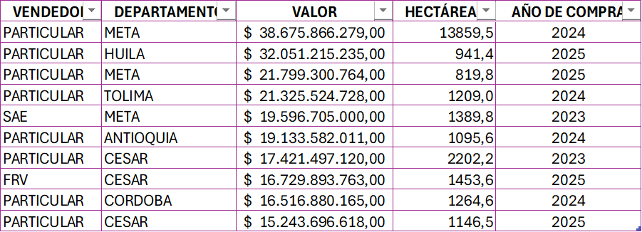 - El departamento con más hectáreas compradas es el del Meta con 79.586 ha, correspondientes a 150 predios