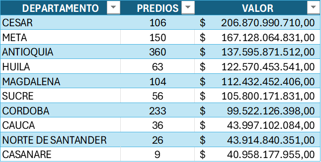 - El departamento con el mayor monto pagado por parte de la ANT para la compra de predios es el del Cesar con una cifra de $206.870.990.710