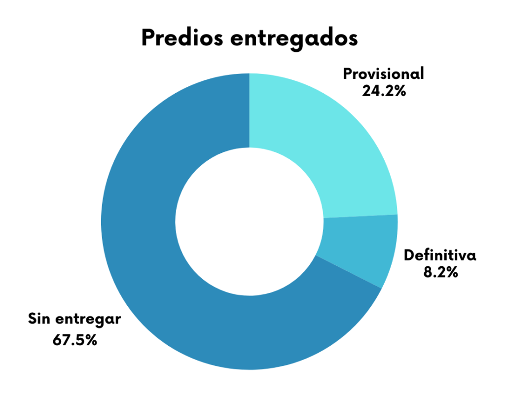 - En total hay 587 predios entregados de forma provisional y definitiva, y de estos 498 no se encuentran adjudicados (302.028 ha), por lo que jurídicamente no son propiedad de los campesinos.